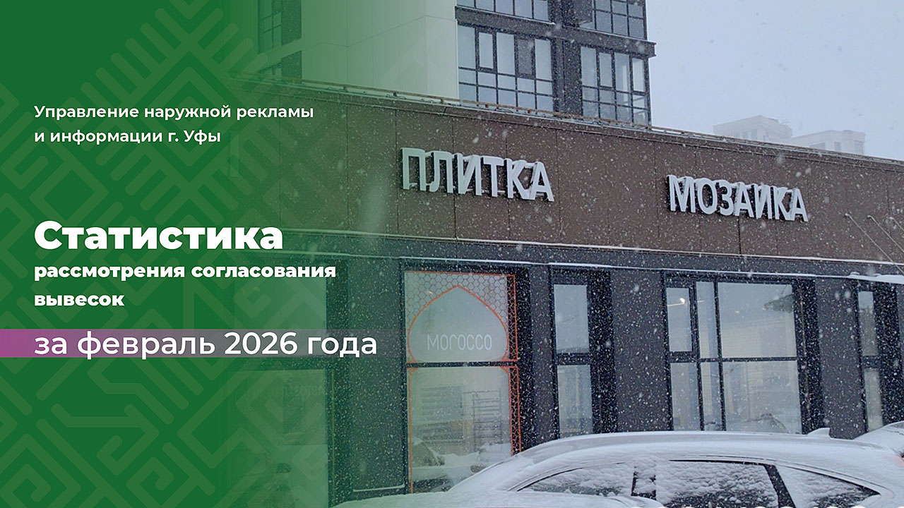 За февраль 2026 года Управлением наружной рекламы и информации г. Уфы рассмотрено 197 заявлений по согласованию дизайн-проектов средств информационного оформления на территории городского округа город Уфа Республики Башкортостан (81 согласовано, 105 отказов).