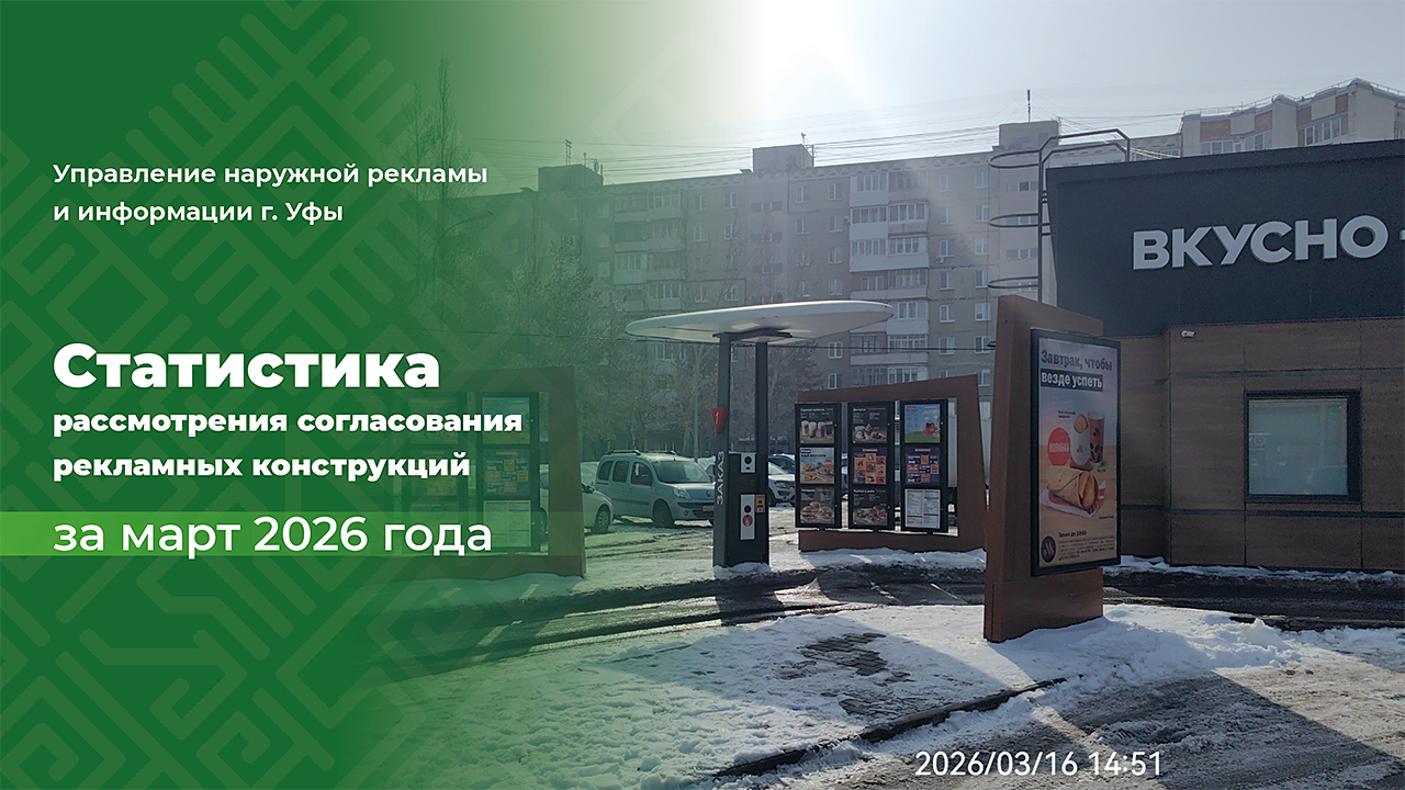 За март в Управление наружной рекламы и информации г. Уфы поступило на рассмотрение 43 заявления на установку и эксплуатацию средств наружной рекламы и информационных указателей на территории городского округа город Уфа Республики Башкортостан, из них 22 – отказы.